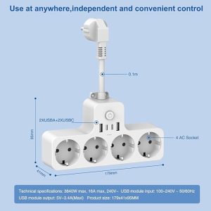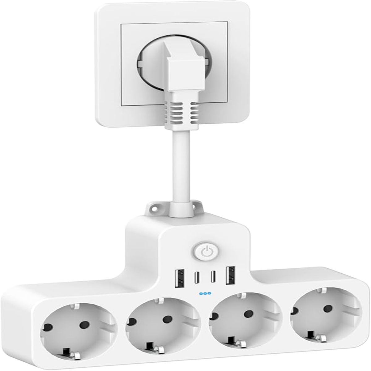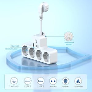- ✔ 【Socket power 4 compartment multi-plug】:El enchufe está equipado con 4 tomas de CA para la carga rápida de hasta 8 dispositivos simultáneamente, con 4 puertos USB con una salida total de 3,4 A, salida Type-C de 3 A, Type-C compatible con portátiles Macbook y otros dispositivos, con tres LED azules y chip inteligente integrado ajustan automáticamente la corriente del dispositivo hasta 4000 W.
