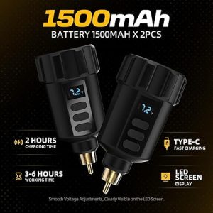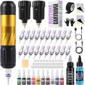 - ✔ ANTIKE Nuevo kit de máquina de tatuaje inalámbrica para principiantes, nuevo diseño de pluma de máquina para 2025, 2pcs lcd baterías de tatuaje para trabajar durante mucho tiempo, 20 agujas de cartucho de tatuaje para su uso diario.